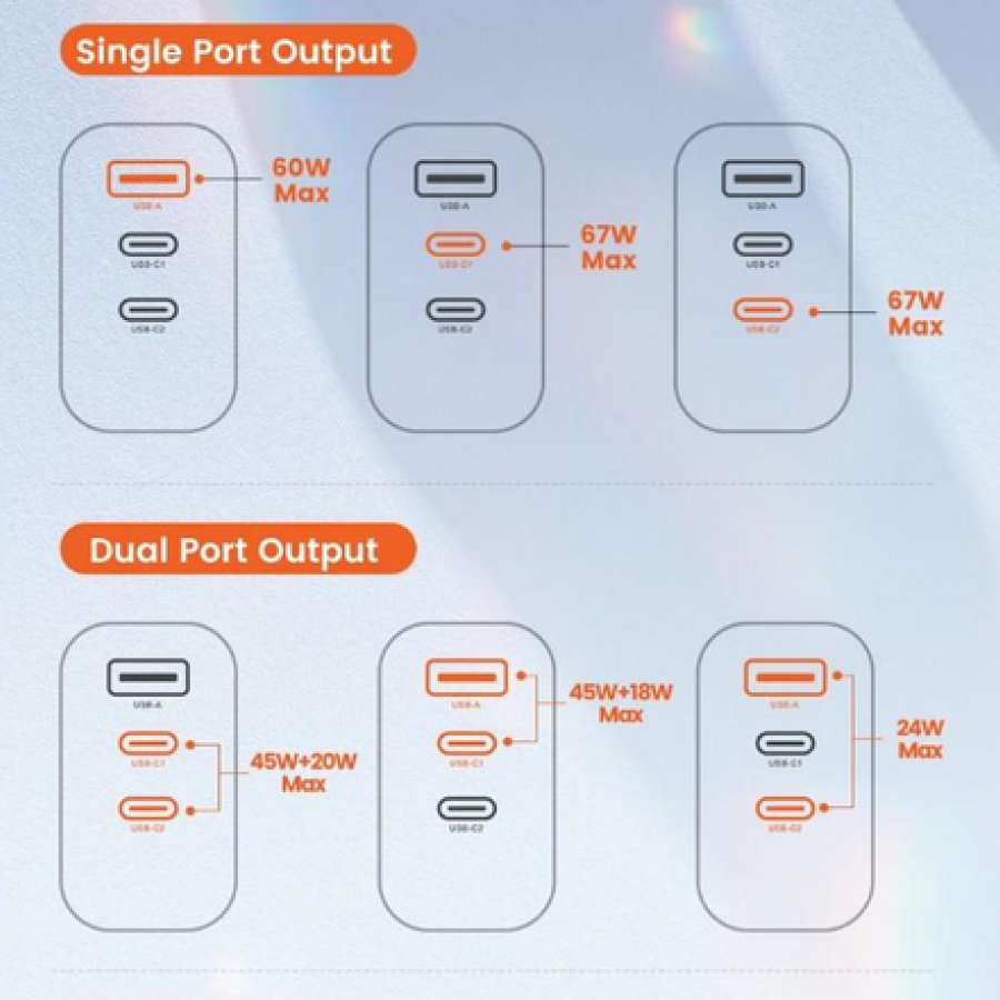 При использовании одного из портов USB-C, адаптер способен выдавать до 67 Вт, что достаточно для быстрой зарядки ноутбуков, таких как MacBook. Порт USB-A также поддерживает высокую мощность до 60 Вт для совместимых устройств.