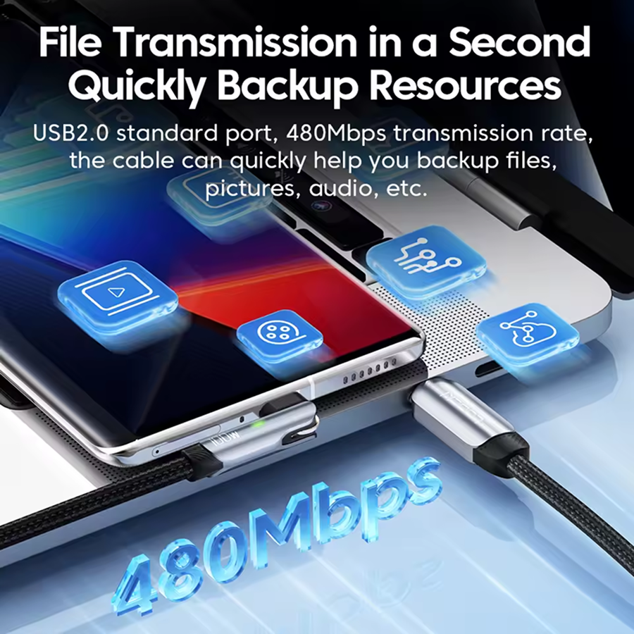 Это не просто силовой кабель. Он поддерживает стандарт USB 2.0 со скоростью передачи данных 480 Мбит/с, что позволяет быстро синхронизировать файлы, фотографии и видео, одновременно восполняя заряд батареи.