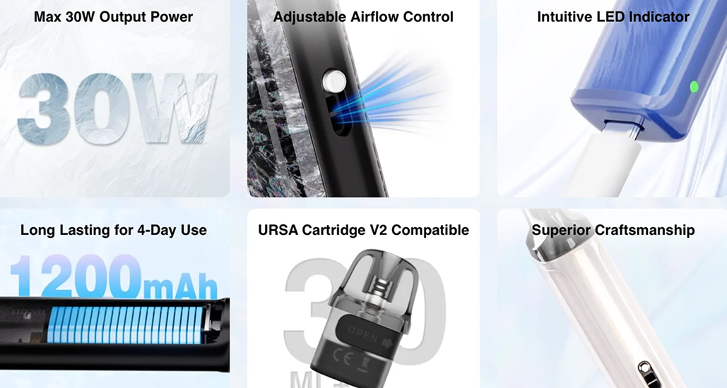 - Совместимые картриджи: Ursa / Ursa V2 (0.6, 0.8, 1.0, 1.2 Ω)