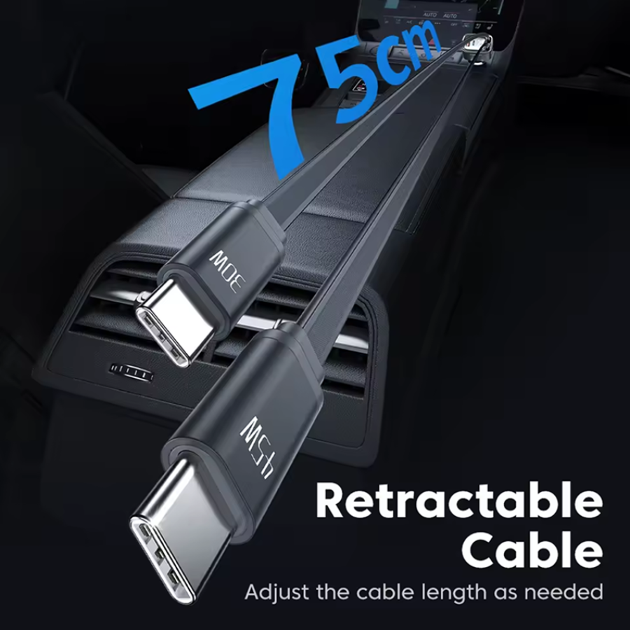 Адаптер оснащений двома висувними кабелями Type-C (один потужністю 45 Вт, інший - 30 Вт). Ви можете витягнути їх на потрібну довжину (до 75 см) і не шукати дроти по всьому салону.